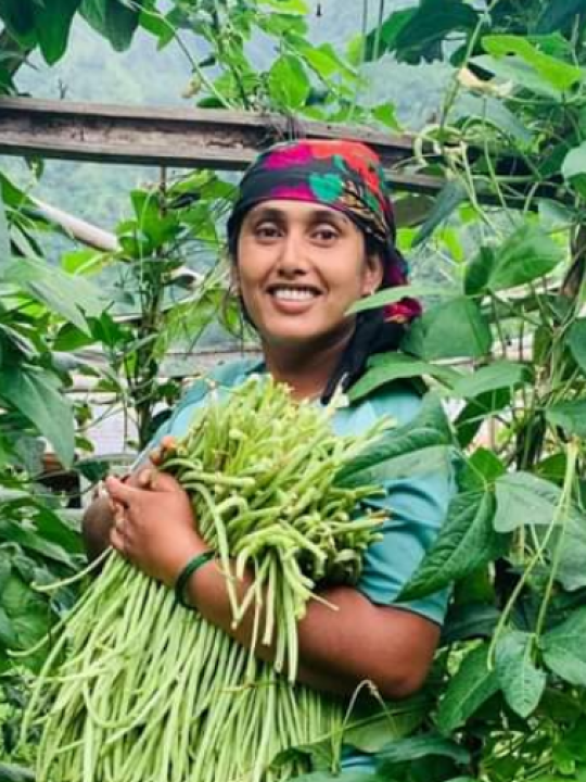 Sumitra Karki's unwavering determination to create her own identity has been a guiding force throughout her life. While her husband, Padam, explored various ventures such as rice milling, poultry farming, and running a shop, Sumitra was right there, learning alongside him. Their village, Galkot, faced numerous challenges with subsistence farming, including low crop yields, dependency on rainfall, limited market access, and threats from wildlife. Witnessing the mass migration of youths to urban areas, leaving behind fallow terrace fields, Sumitra found inspiration in a successful model of collective farming in Palpa.